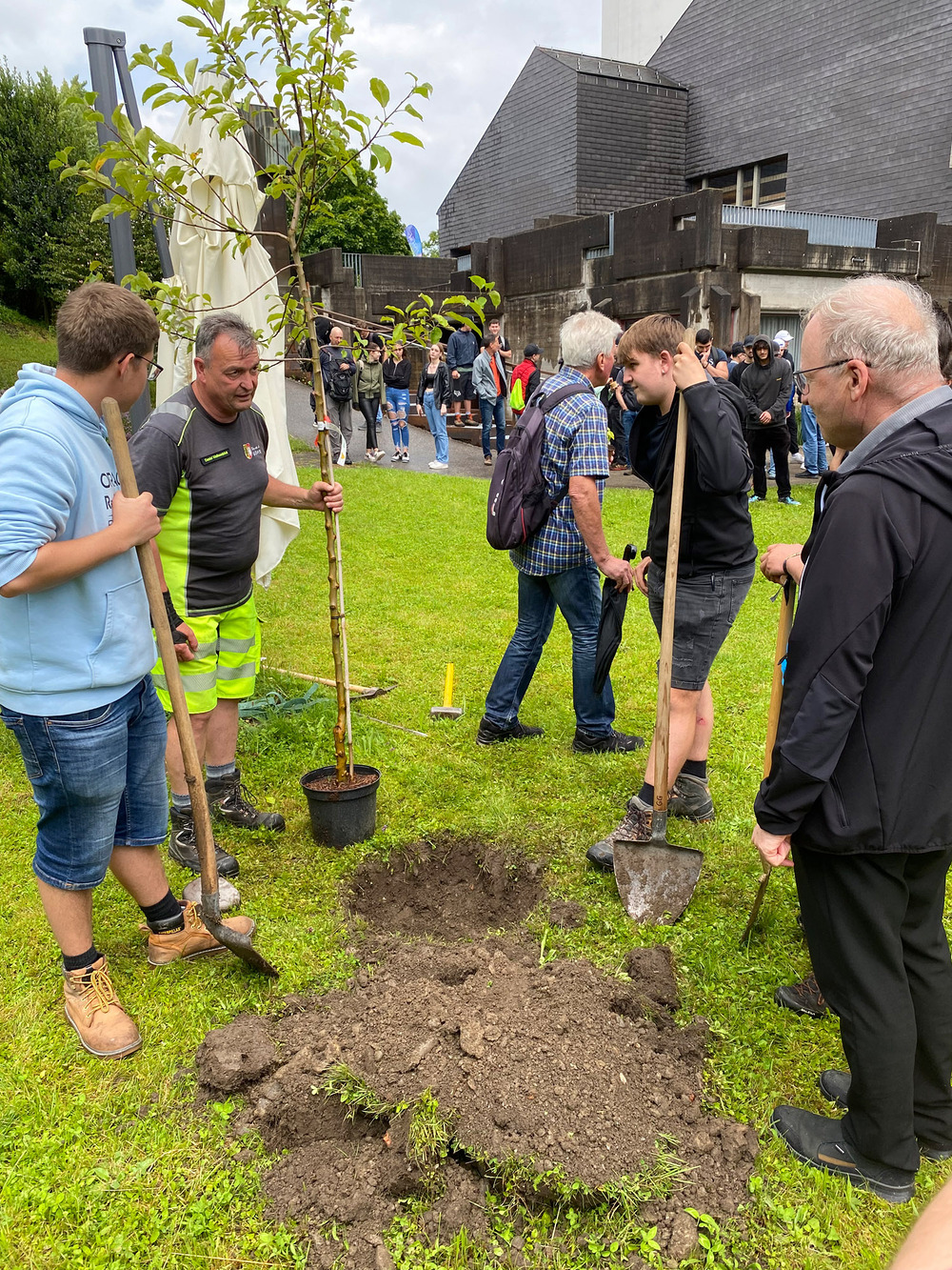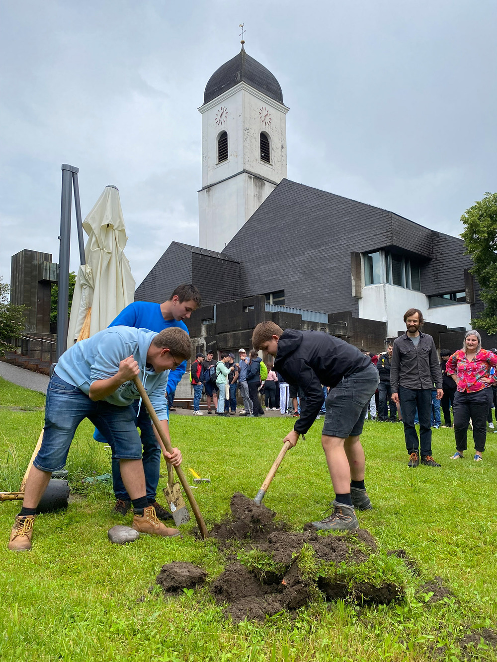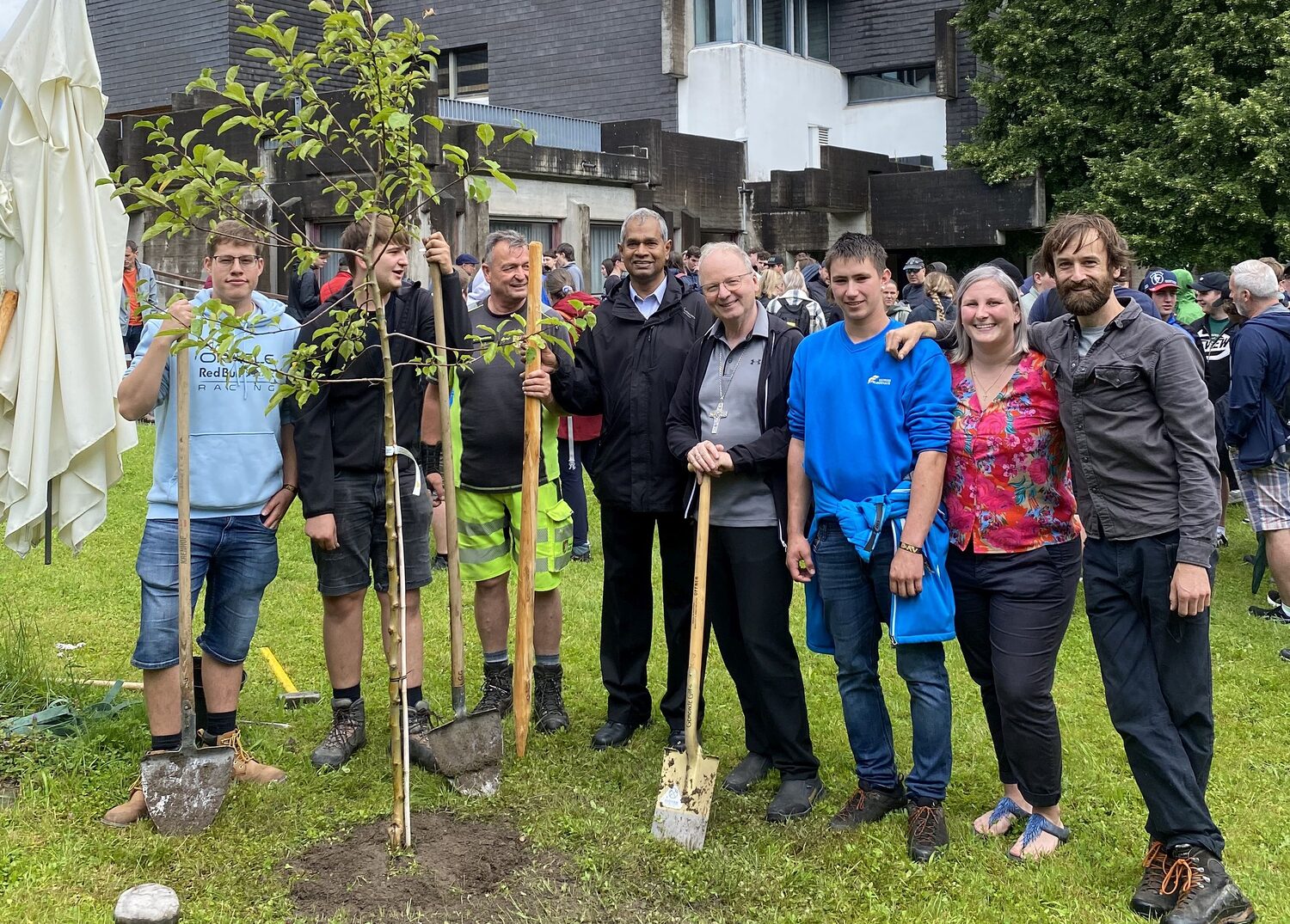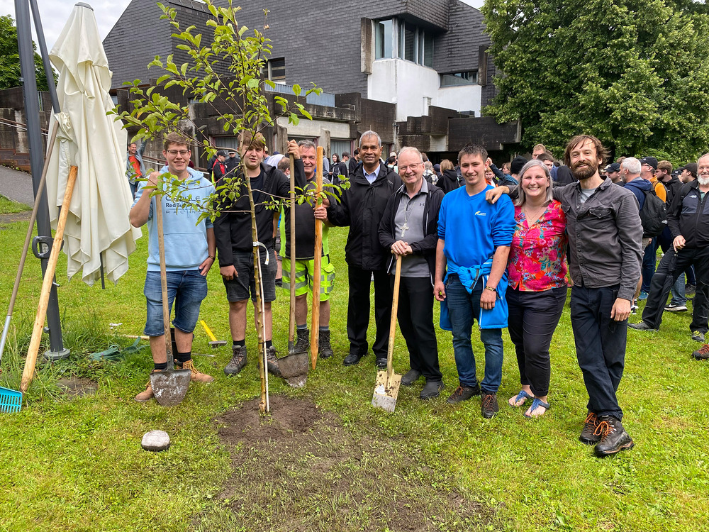 Am Ziel in Göfis angekommen, feierte Bischof Benno Elbs, der die Jugendlichen zuvor auf ihrem Weg begleitet hatte, gemeinsam mit allen Teilnehmer:innen einen Gottesdienst. Nach dem Mittagessen wurden im Beisein des Bischofs rund um die Pfarrkirche dann noch drei Bäume gepflanzt. „Um ein Zeichen für die Zukunft zu setzen, etwas Positives zu hinterlassen und die 10 Jahre zu feiern, die wir jetzt schon gemeinsam mit den Lehrlingen unterwegs sind“, so Mona Pexa von der Jungen Kirche, die die Lehrlingswallfahrt auch heuer wieder organisiert hat.