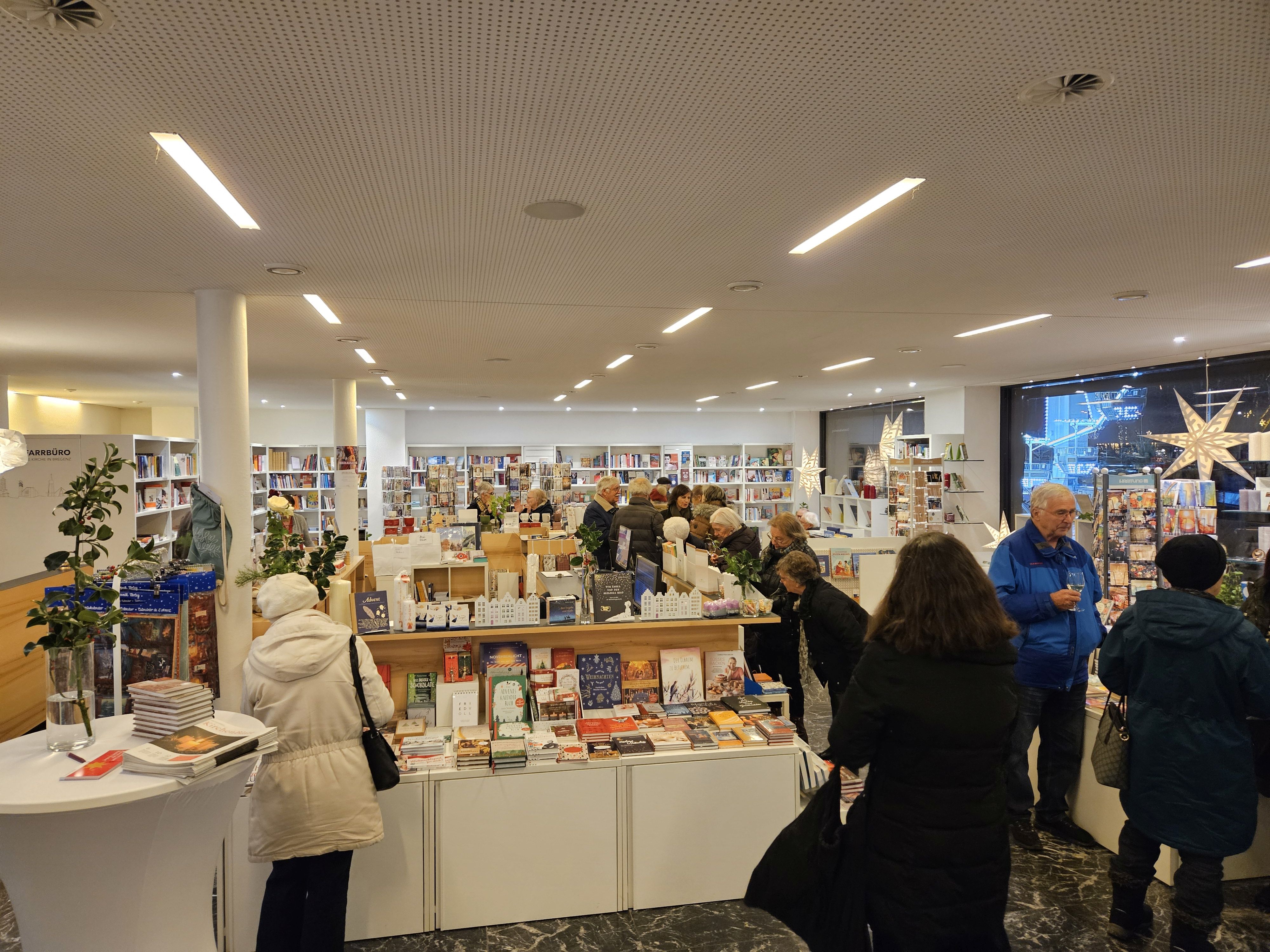 Nach der Lesung nahmen dann die Besucher:innen die Einladung zu einem warmen Getränk und freundlichen Gespräch in der Buchhandlung Arche in der Rathausstraße gerne an.