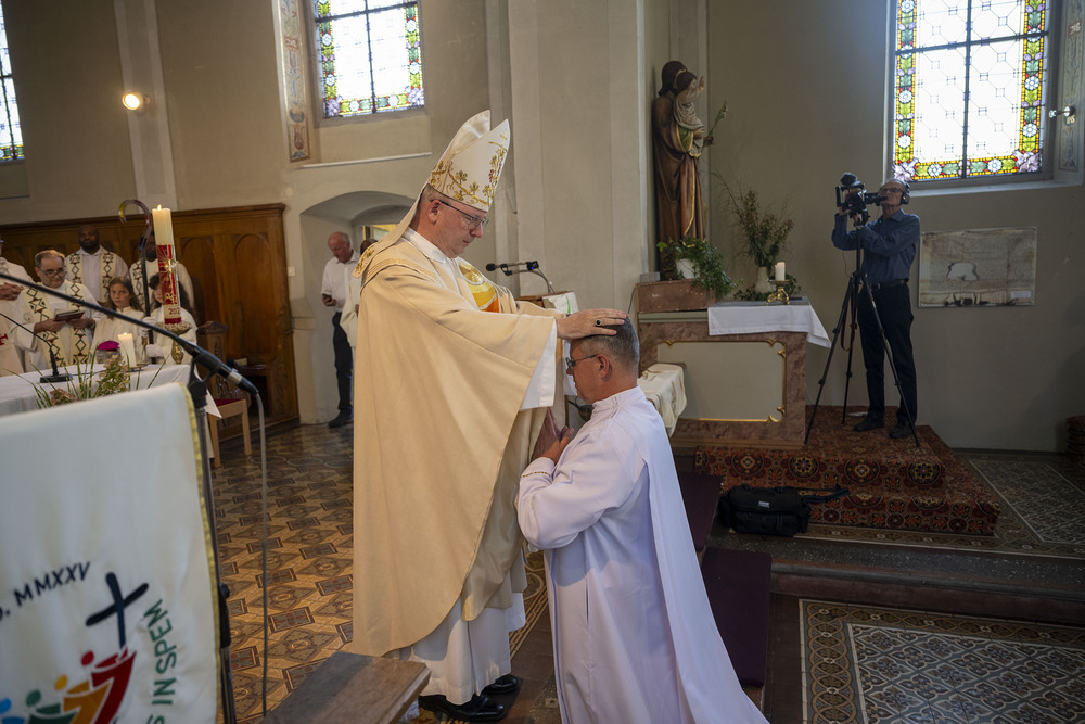 Mario Nachbaur bekundete schließlich vor der gesamten Gemeinde, dass er bereitwillig dieses Amt annehmen möchte. Mit diesem Versprechen bekräftigte er die Bereitschaft, den Glauben in Wort und Tat zu verkünden, das Stundengebet der Kirche zu pflegen, sich für die Armen und Kranken einzusetzen, den Notleidenden zu helfen und auf diese Weise sein Leben nach dem Beispiel Christi zu gestalten. Bischof Benno nahm anschließend die Weihe durch Handauflegung und Gebet vor. Es folgte das Anlegen der Stola und Dalmatik. Bischof Benno sprach dem neugeweihten Diakon den Frieden zu und besiegelte damit die Aufnahme in das neue Amt.