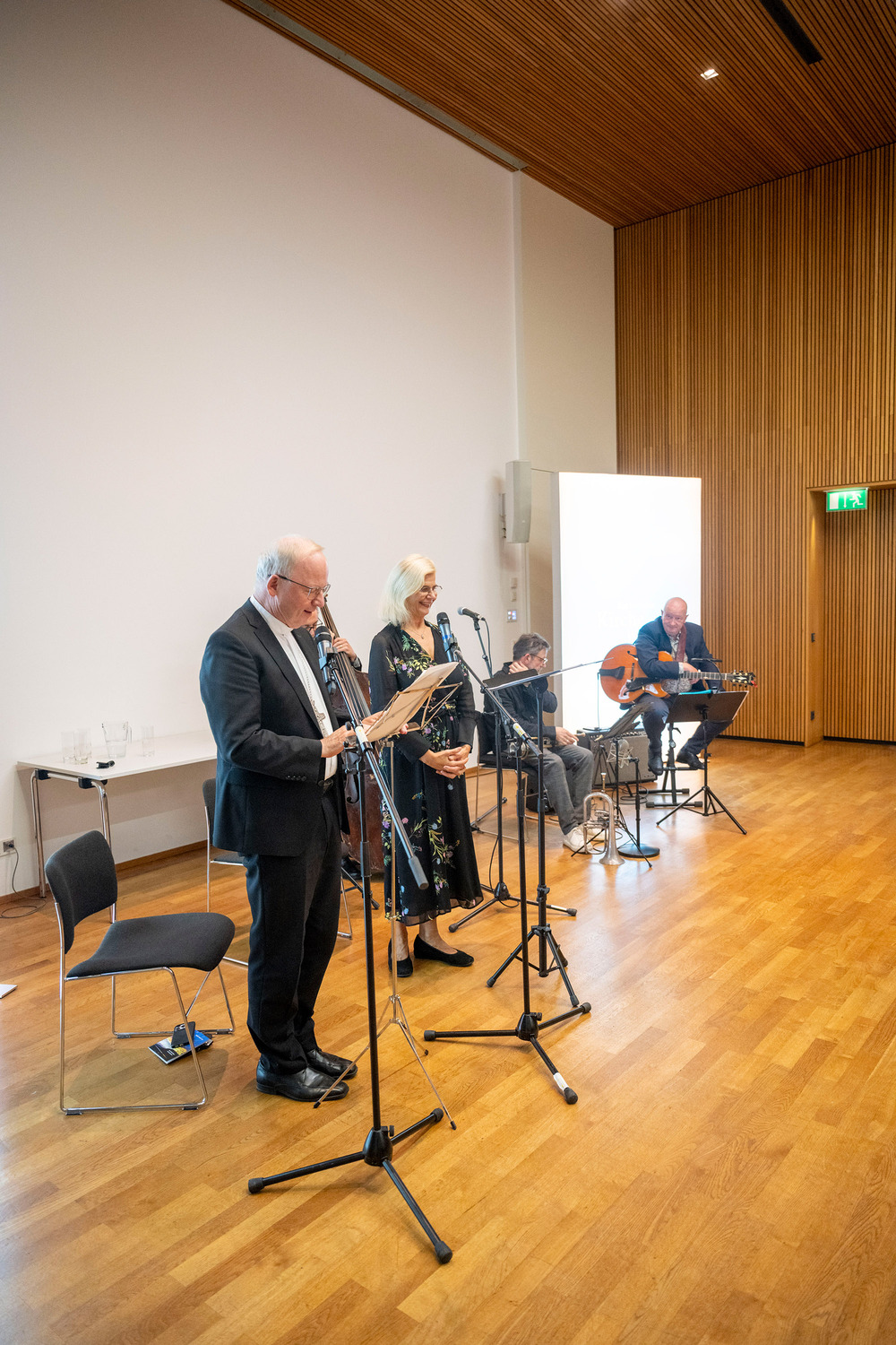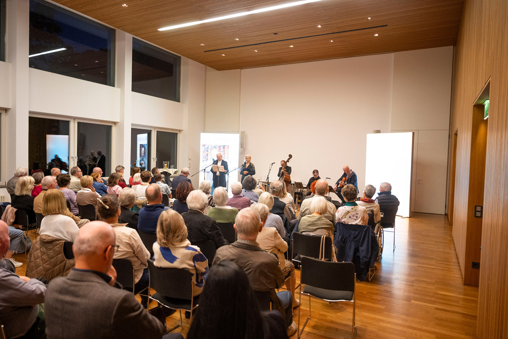 Dann war es Zeit für einen Abend, der unter dem Motto „Wege der Zuversicht“ stand. Regisseurin und Schauspielerin Renate Bauer trug gemeinsam mit Bischof Benno Elbs aufmunternde Texte vor, harmonisch begleitet durch die Jazzklänge der Musiker Rosario Bonaccorso (Kontrabass), Herbert Walser Breuss (Barocktrompete) und Armin Bonner (Gitarre). Mutmachende Worte des Lyrikers Rainer Maria Rilke oder von Papst Franziskus („Zuversicht ist die Atemluft eines Christen“) bildeten dann eine inhaltliche Brücke zu Bischof Bennos Gedanken. So nahm er etwa Bezug auf die jeweilige Einstellung des Menschen, wenn er mit Problemen konfrontiert ist. „Die Weisheitsschriften der Bibel lehren uns vertraute Gelassenheit gegenüber den Wechselfällen des Lebens und auch König Salomo wusste bereits ,ein bedrücktes Gemüt lässt die Glieder verdorren‘. Es liegt also, ein Stück weit auch immer in der eigenen Entscheidung wie viel Gewicht man dem Belastenden, dem Schweren zugesteht. Oder wir versuchen den Blick auf das zu legen, was uns stärkt, was Freude und Zuversicht bereitet.“