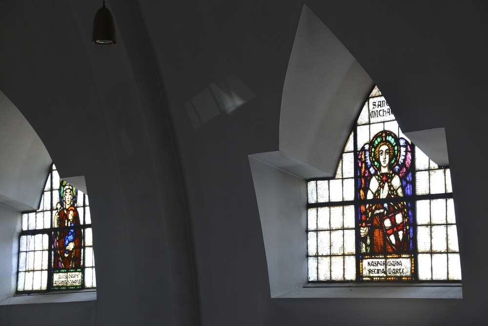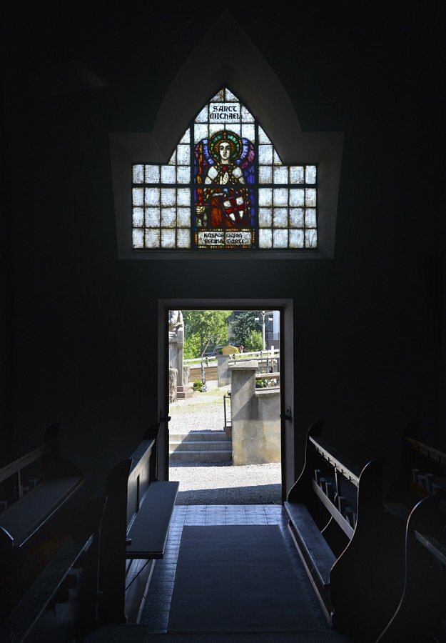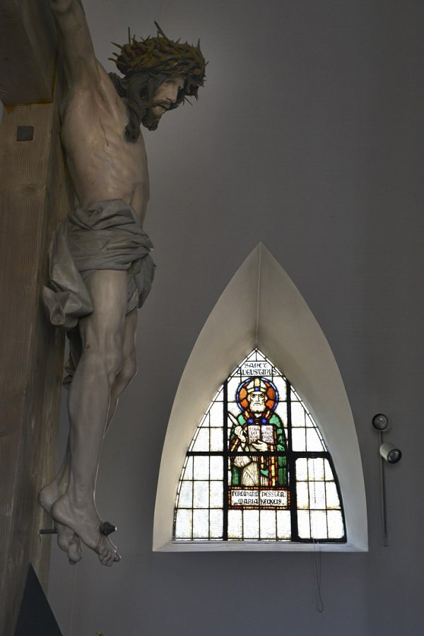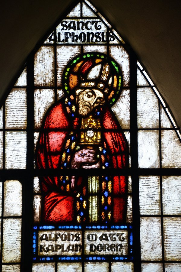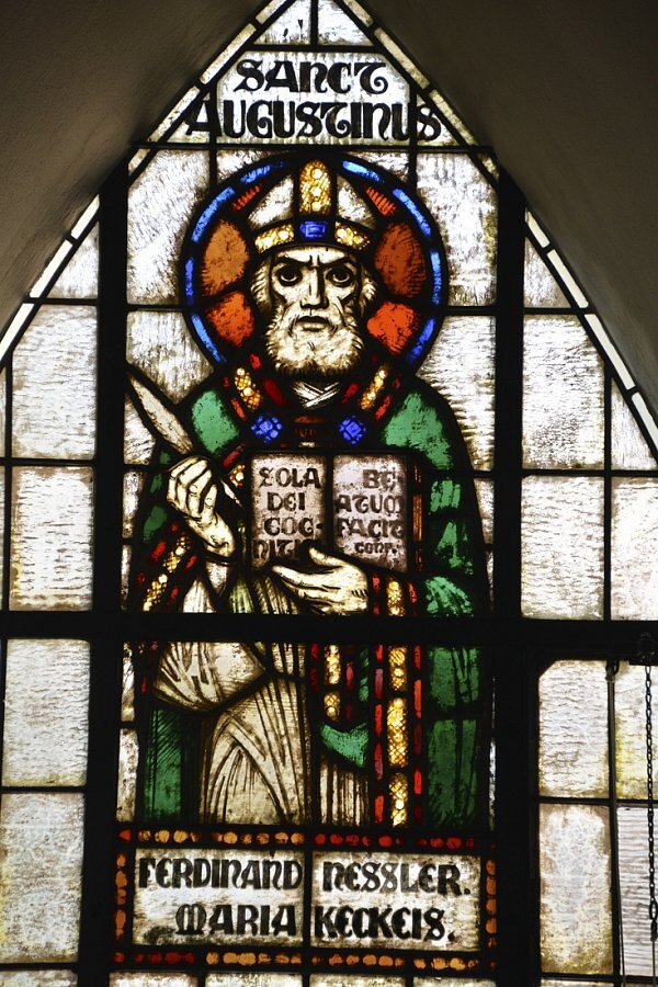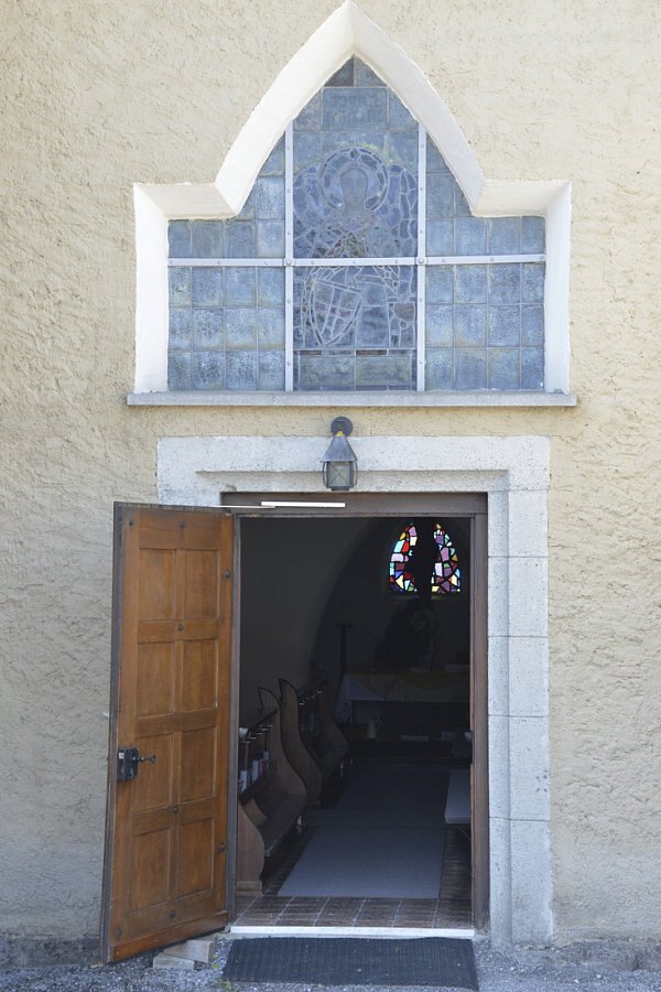 1922/23 nach Plänen von Architekt Clemens Holzmeister (später auch Kirche Mariahilf Bregenz) als erster "moderner" Kirchenneubau in Vorarlberg erbaut, trapezförmige Glasfenster, Ausführung Tiroler Glasmalerei Anstalt Innsbruck, Entwurf Gottlieb Schuller
